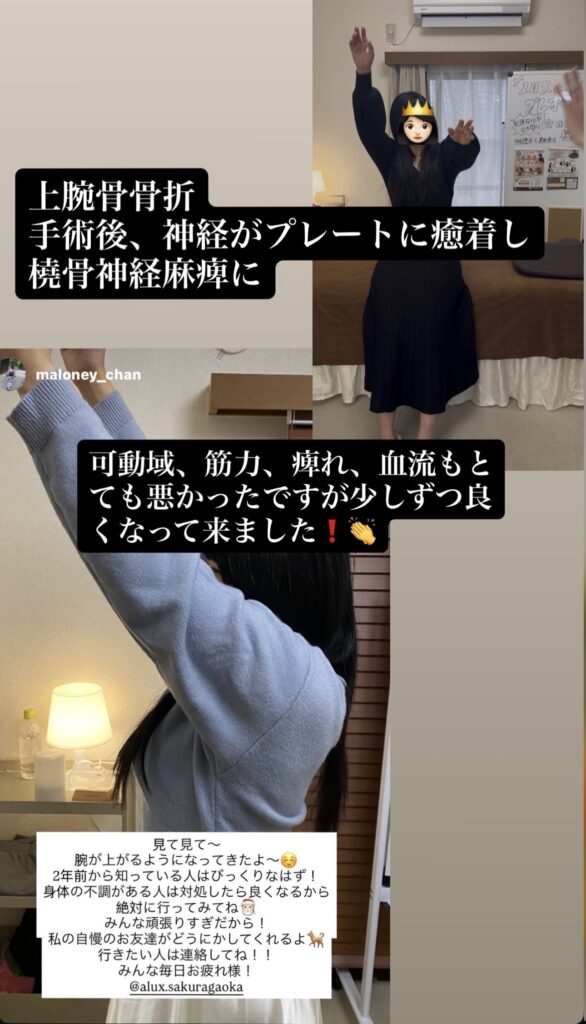 この方は上腕骨骨折後手術しましたが固定具のプレートが神経に癒着してしまい、後遺症としてしびれと運動障害が残ってしまっていました。